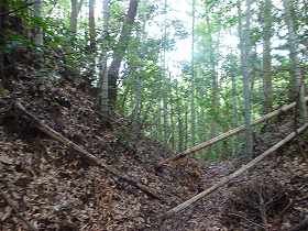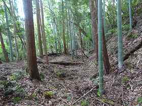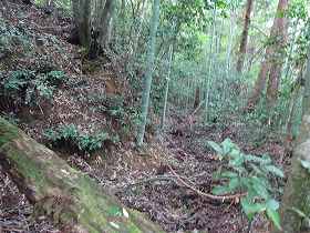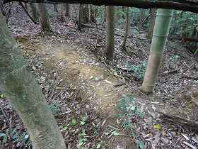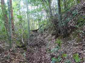 翻って1郭南側の大堀切から、南側の自然地形の斜面を登って行くと、その先に土橋と浅い堀切とがあった。堀切は防御性の薄いものであるが、これが城域を区画する堀切となっていたものであろう。