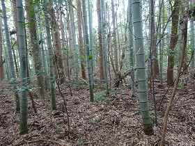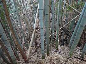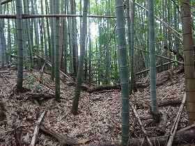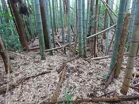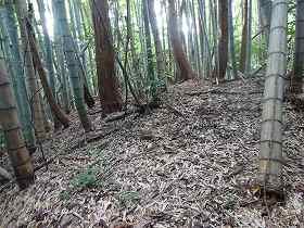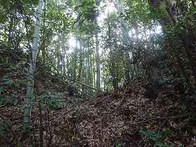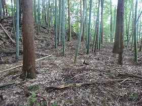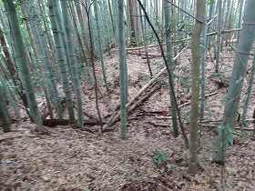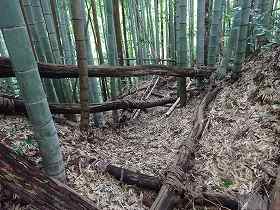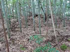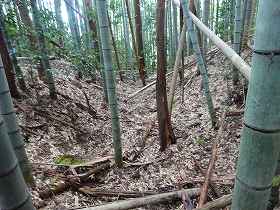 この先には6郭があり、横堀を巡らせたしっかりとした構造をしているらしい。ところが、この堀切から先、倒竹が激しくて、簡単に進入することができないような状態であった。この先の予定もあったので、ここから先に進むのは断念した。したがって、ここから先の部分は『図解 近畿の城郭』の図に完全に頼り切ったものである。