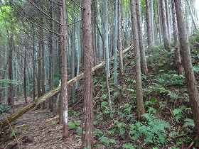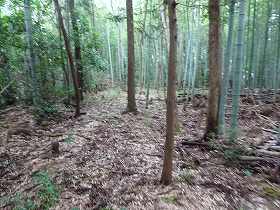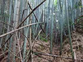 この大神宮から城山方向に向かっていく。城への登城道はないので、どこかから直登していくしかない。下の写真の部分が比較的登りやすかったのだが、登り始めは鬱蒼としていてあまり雰囲気がよくない。しかし、登って城内に入れば、ヤブながらも進みやすい状態になる。