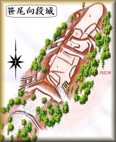笹尾向段城は、円応寺の北側にそびえている比高20mほどの山稜に築かれていた。正面下にある円応寺は、石垣で囲まれた見事な寺院であり、あるいはここが平素の居館であったのかもしれない。
