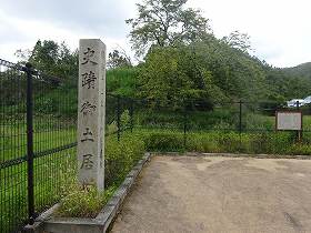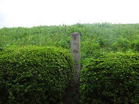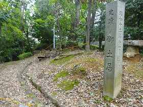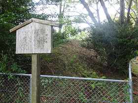 | 狭い道路の脇にある石碑。横に車を停められそうなスペースがあるのだが、輪留めがあって、入ることができない。車を停められそうな場所がまったくない。 | 碑の横の柵から土塁を遠望する。 |