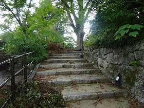 御土居の入口に近づいてみたのだが、この日、もみじ苑に入る階段は閉鎖されていた。見ると「本日荒天のため、公園は閉鎖します」と書かれてある。この日、雨風がなく、まったく荒天ではなかったのだが、いったいどうしたことだろう。先日襲った台風20号(関西国際空港が、沈んでしまったやつである)の影響で閉鎖されたままになっているのであろうか。解放されていれば、御土居の上を散策できるようになっている。