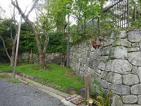 | 堀川通りをはさんで西側にある土塁。 | 加茂川中学校の北側にある土塁。東の角で折れて、鴨川沿いに延びていた。 |