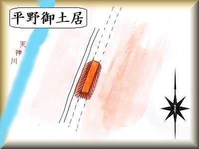 平野御土居は、北野天満宮の北側の住宅街の中に残されている。残っている部分は長さ20m程度でしかないが、残存部分はその形状もいかにも土塁らしくよく残されている。ただし、側面部の道路は、非常に狭く、対向車とすれ違うことも難しいような道であり、車を停めておくこともできないため、見学には気を遣う。車は北野天満宮において歩いてきた方が無難かもしれない。