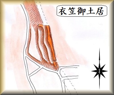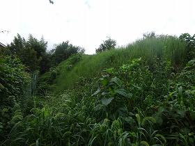 | 車を降りると、斜面が三段に削平されているのが分かる。 | 2段目の帯曲輪と土塁の壁面。 |