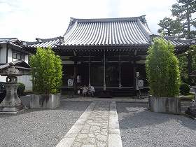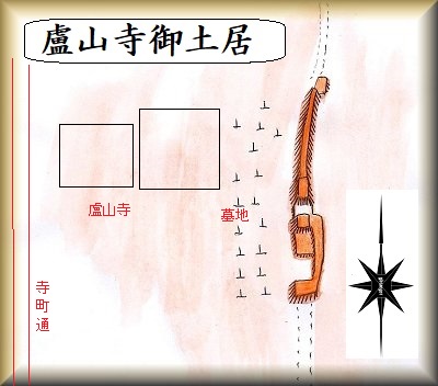 | 盧山寺の本堂。 | 墓地奥の御土居の中心部の削られた部分に碑が建てられている。 |