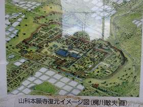 | 山科本願寺が蓮如によって建立されたのは文明10年頃であった。もっとも、最初からこれだけの巨大なものであったわけではなく、戦国期の騒乱が起こってくるにつれて、次第に要塞化して巨大な寺内町が形成されていったものと思われる。寺院とそこに暮らす人民を守るために、人民総出で工事を行ったものであろう。 しかし、天文元年(1532)、細川晴元に攻撃されて落城してしまった。その後、本願寺は摂津石山に移転され、石山本願寺として、その威容を誇ることになる。 |