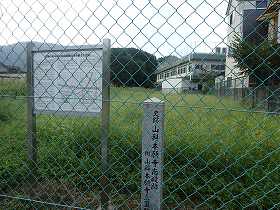 | 北側の金網越しに案内板と碑が建てられている。 | 東側の土塁。外側には堀跡がある。 |