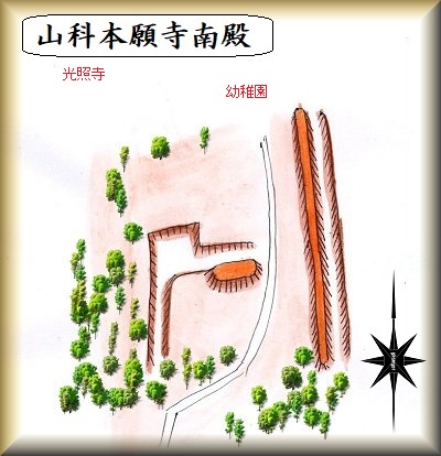 山科本願寺南殿の遺構の一部は、光照寺幼稚園の南側に残されている。というわけで、遺構を見るためには、幼稚園を通り抜けていかなければならないので、幼稚園に許可をもらった方がよいと思う。車は許可をもらえれば、幼稚園に停めさせていただくことができる。
