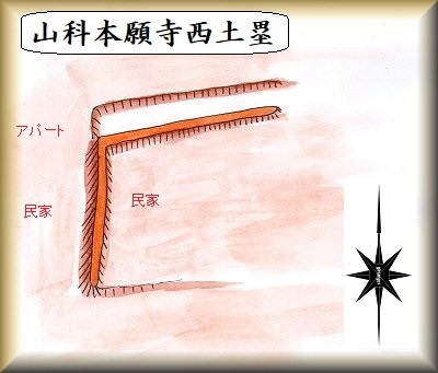 山科本願寺の西側の土塁の一部が山階町の住宅街の中に残されている。