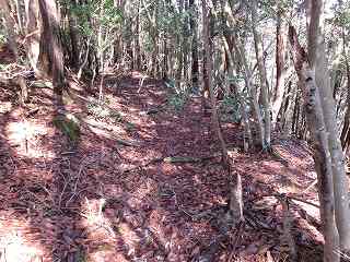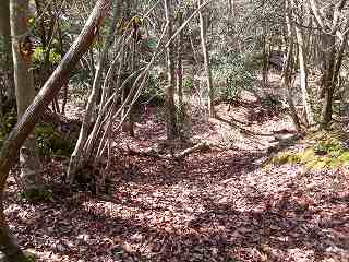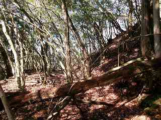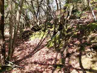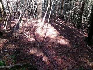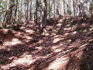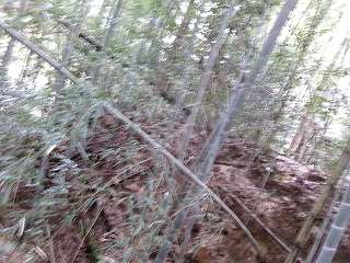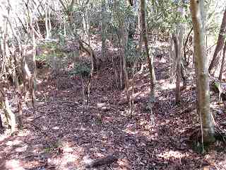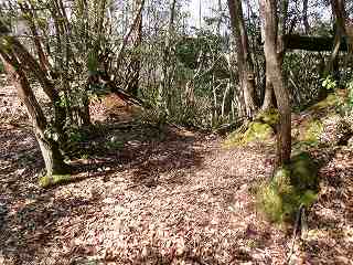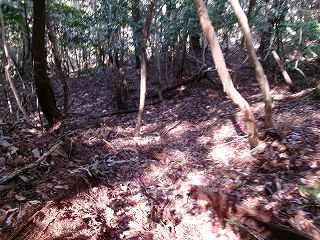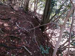 そこからは斜面を直登していく。すぐに竪堀のようなものがあり、帯曲輪の所に到達する。