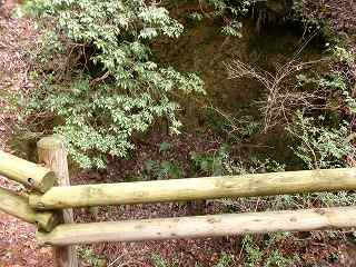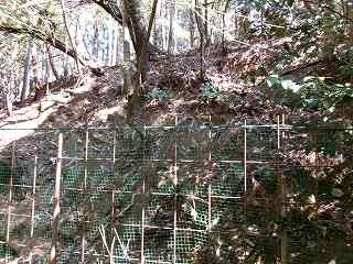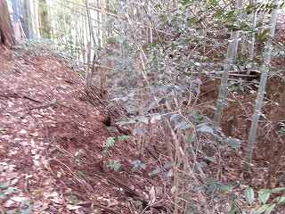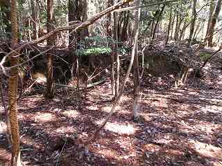 | この柵を開けて林道を進んで行く。 | 堀状の窪み。 |