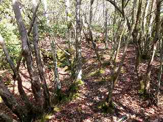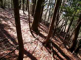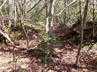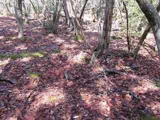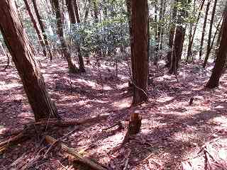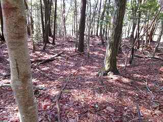 さて、柵を開けて林道を進んで行って、テキトーなところから南側の城址方向に進んで行く。