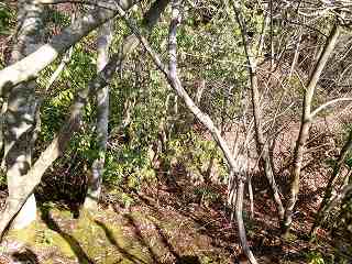 地形図を見ると宇津木寺の北端辺りから山道が付けられているようなので、北側に回り込んで行き、テキトーなところから山を登って行った。
