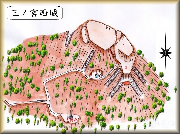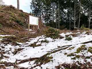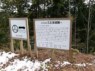 城山の東側の側面部には「三ノ宮城跡」と書かれた看板が立てられており、城路を通過する際に、そこが城山であることが一目で分かるようになっている。