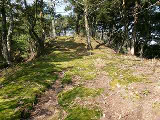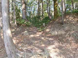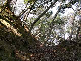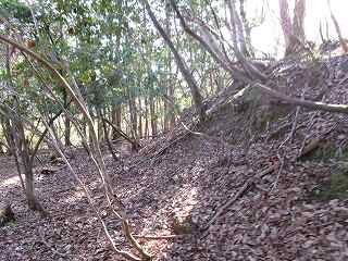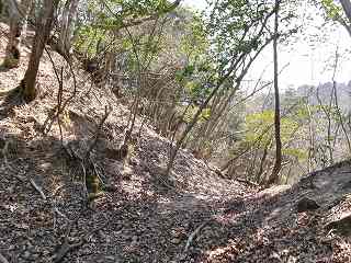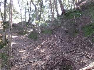 1郭の北西側には土塁が盛られている。その西側下は大堀切となって尾根筋を分断している。