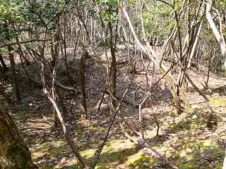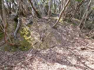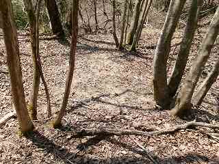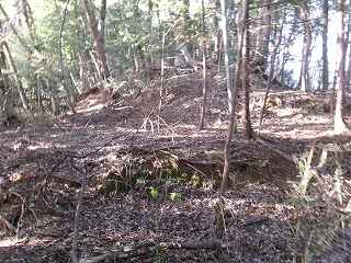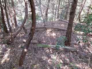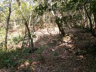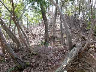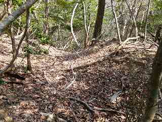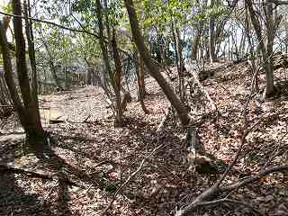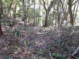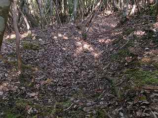 | 2段堀切の先の尾根を南側に進んでD城を目指す。 | D城の2郭城塁と堀切が見えてきた。 |