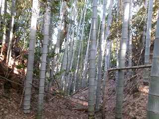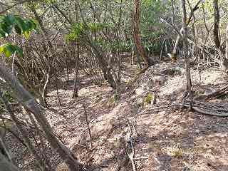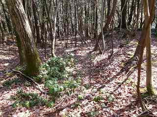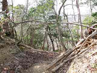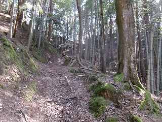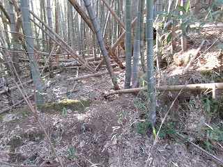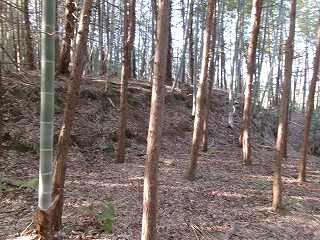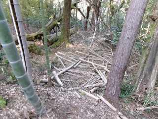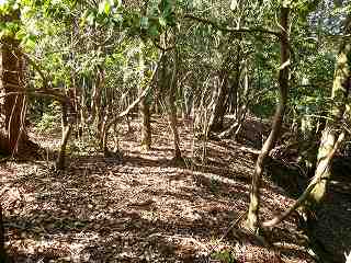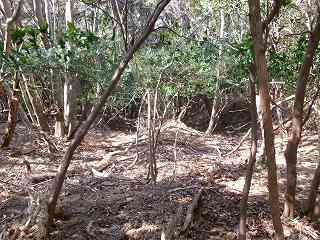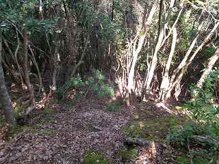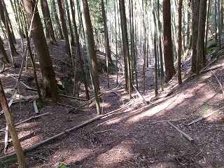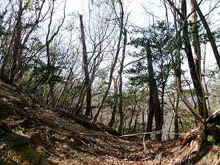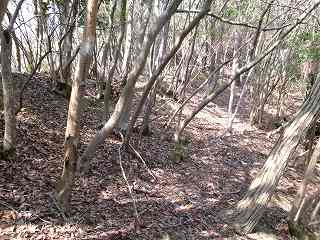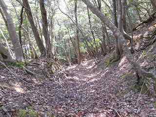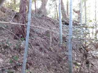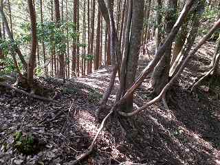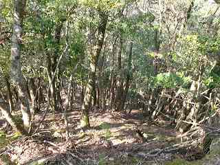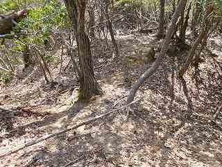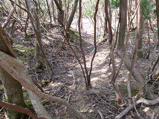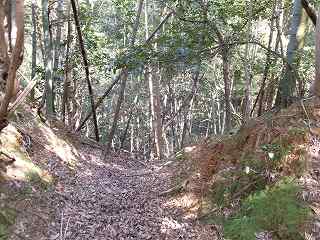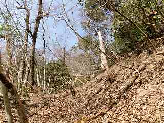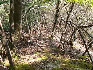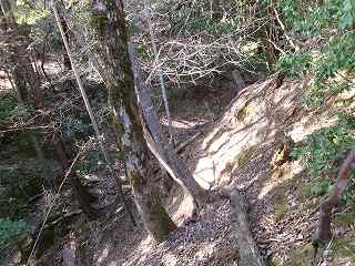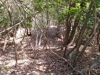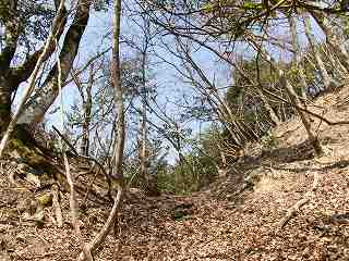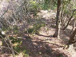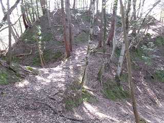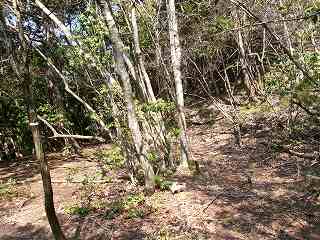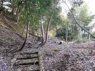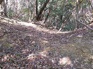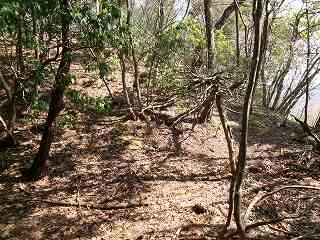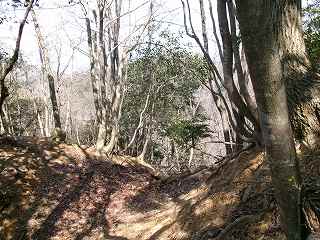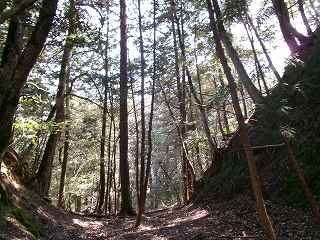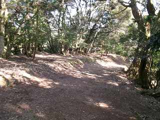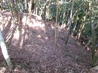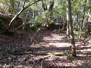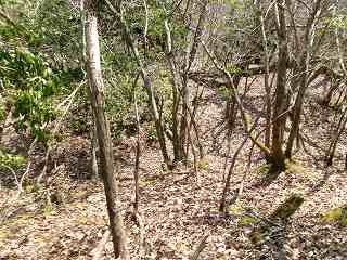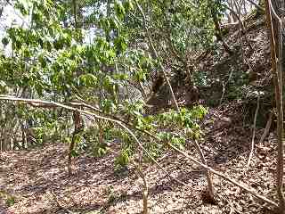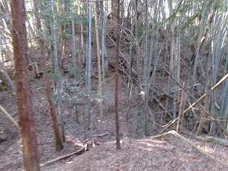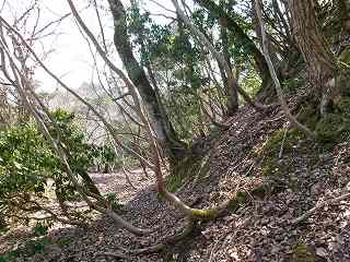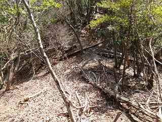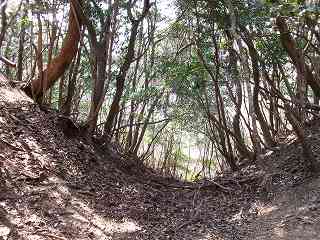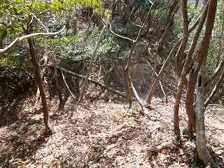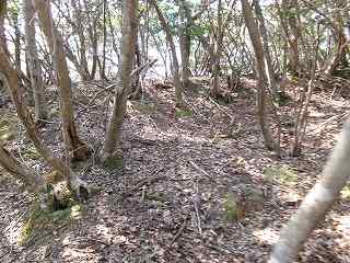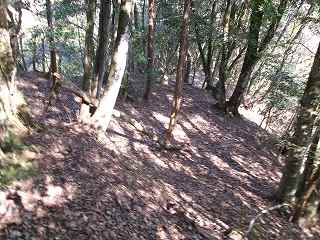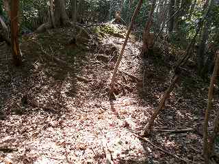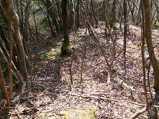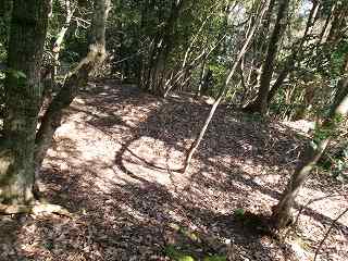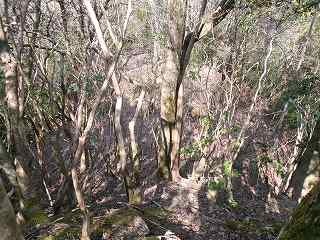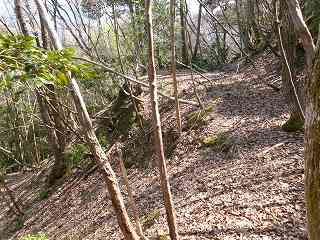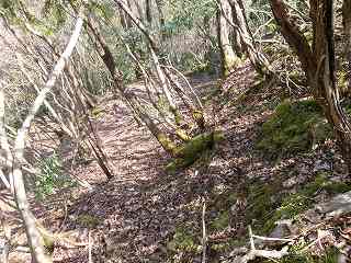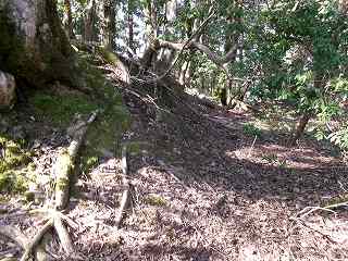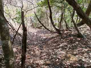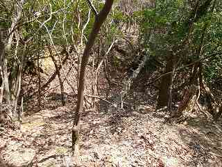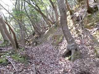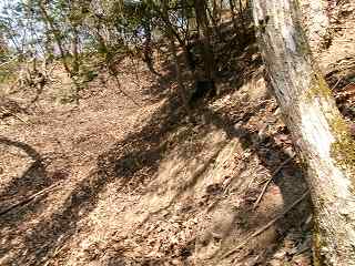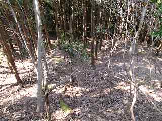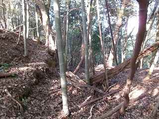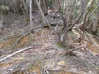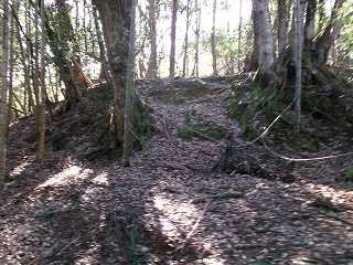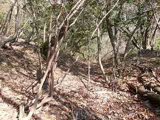 | 尾根伝いにC城に登って行く。尾根の途中にあった切岸。 | C城へ。 |