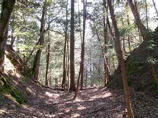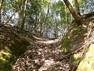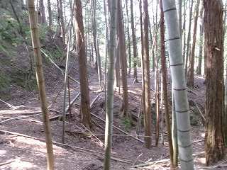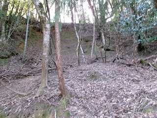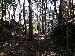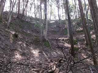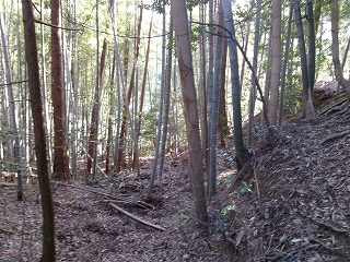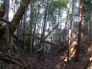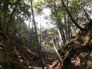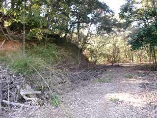 | 道路脇の竪堀からよじ登った。 | 竪堀と城塁。 |