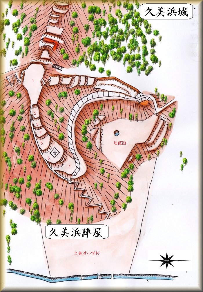 久美浜城は、久美浜の港を見下ろす比高60mほどの山稜に築かれている。