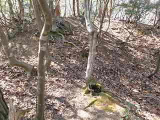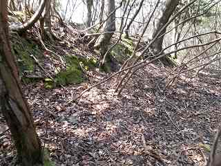 左側の尾根を登って行くと、段々のテラス状の郭を経由して、3郭の南端部下に到達する。どちらから登っても城内に入って行ける。