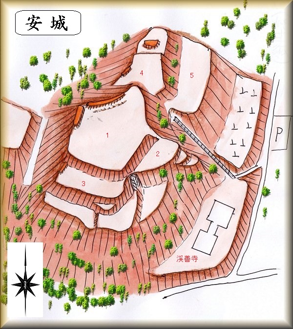 渓善寺の北西側にそびえている比高40mほどの山稜が安城の跡である。