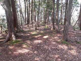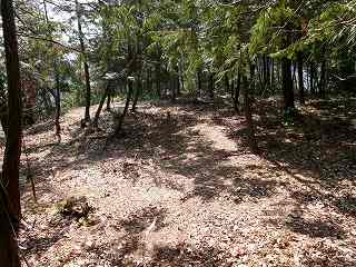 この尾根をまっすぐに進んで行くと、尾根はいったん降って上がったところが1郭である。1郭は長軸20mほどあり、2郭よりはまとまった広さを有しているが、あまり広いものではない。森城は、多数の人員の籠城を意識した城郭であるとは言えない。