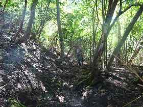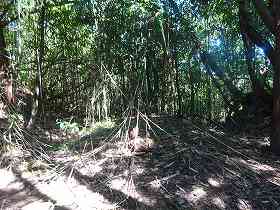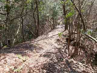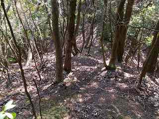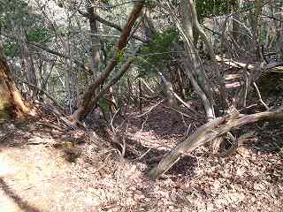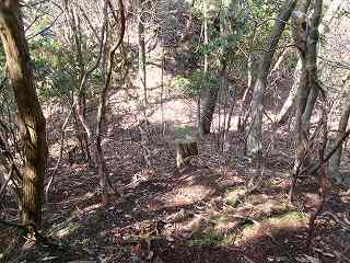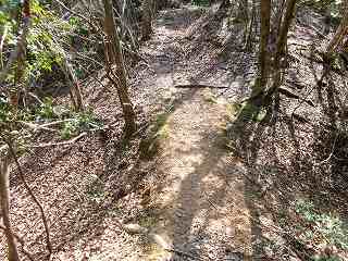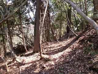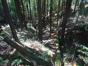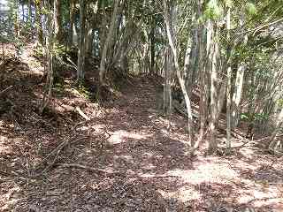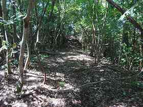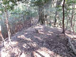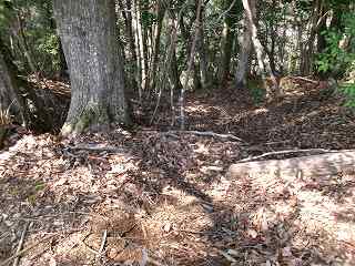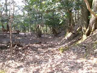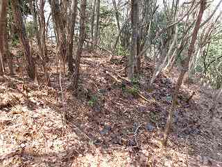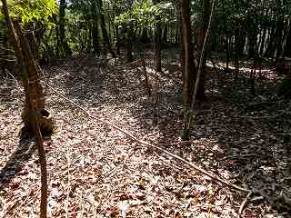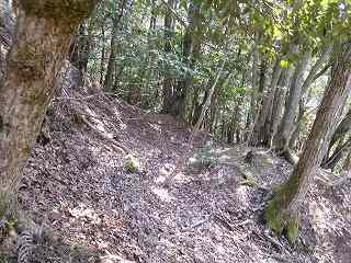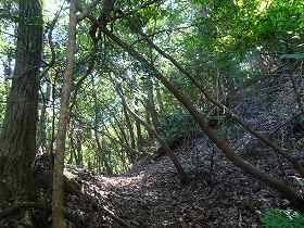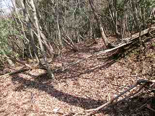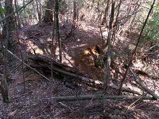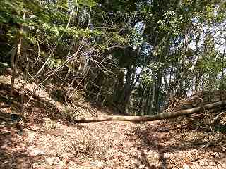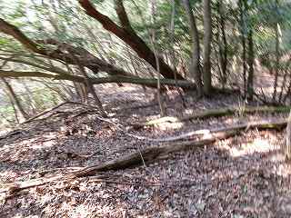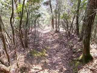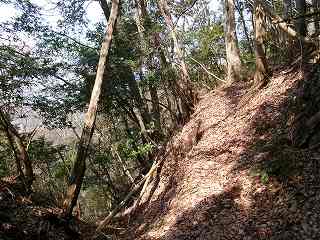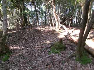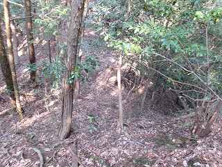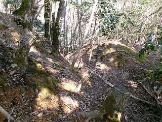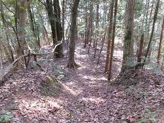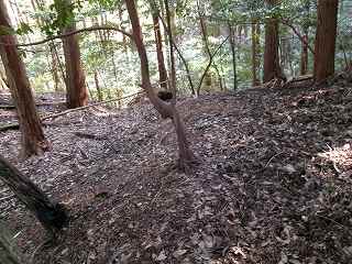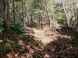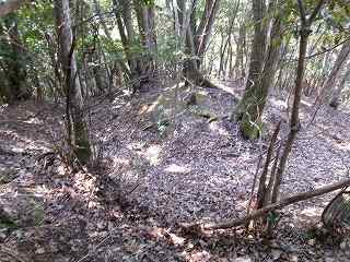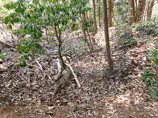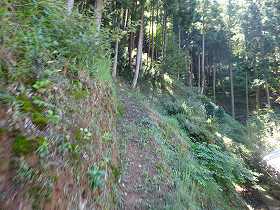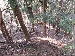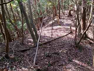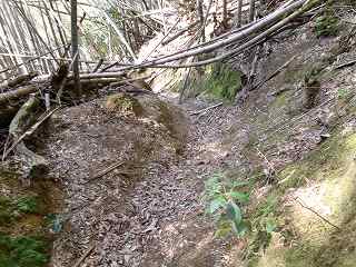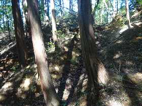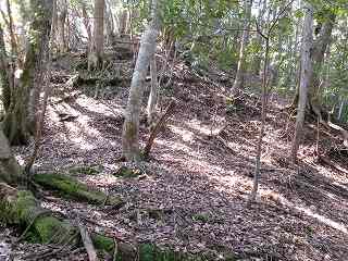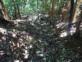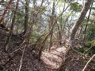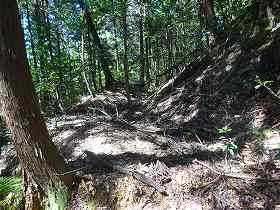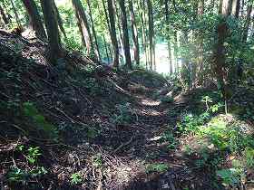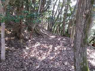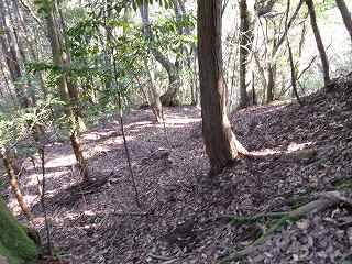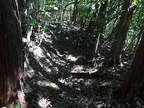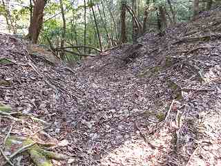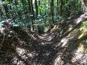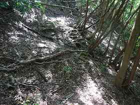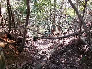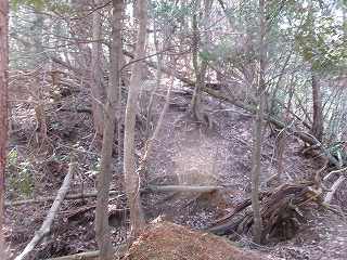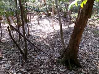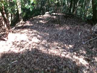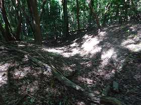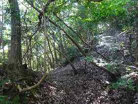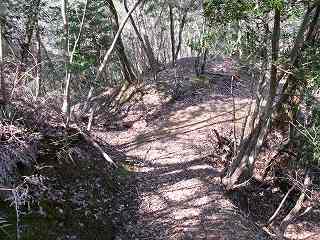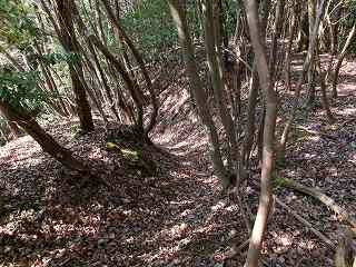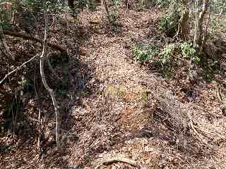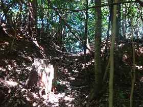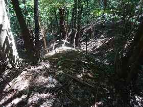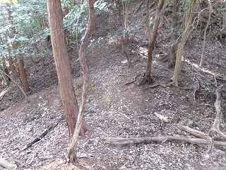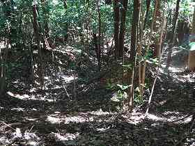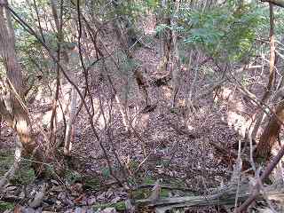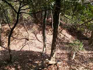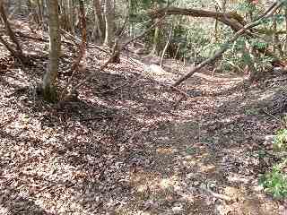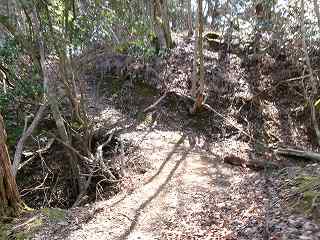 | 参道は斜面沿いの細い道である。 | 3郭手前の竪堀。 |