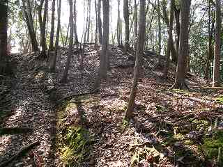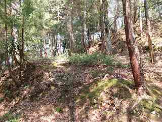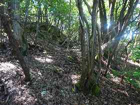 | 2郭手前の堀切。 | 2郭の城塁と帯曲輪。2郭は細長い郭である。 |