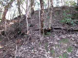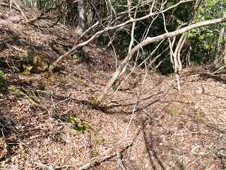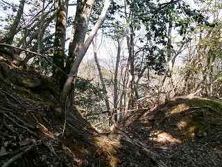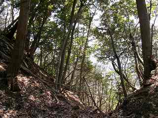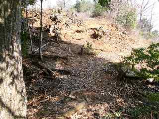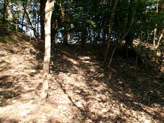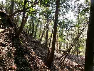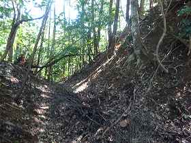 | 再び南側へ。南側斜面の畝状竪堀。 | 1郭手前の堀切を下から見上げたところ。 |