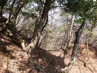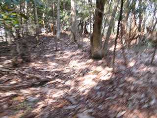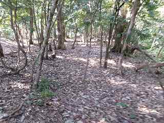 私は、東側の団地の一番奥の所から登って行ったのだが、西側の団地からでも登れると思う。とりあえず斜面を比高30mほど登って行くと、北側の尾根の所に出た。後はこの尾根を進んで行くと、城の中心部に到達することになる。