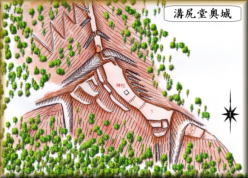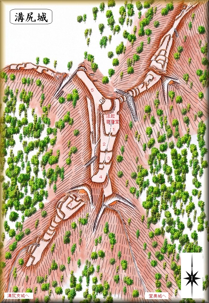 溝尻城の山の中腹部分には西に溝尻支城、東に堂奥城という2つの支城があり、いずれかを経由して登って行くことになる。