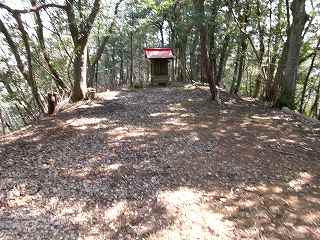 この上が堂奥城の1郭である。登ってみると、長軸80mほどの細長い郭で、内部の中央付近に小さな神社が祀られていた。