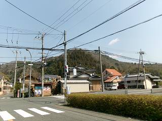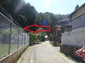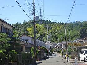 | 北側から遠望する宇谷城。ここからの比高は50mほど。 | 北側の民家の脇の所を入ると参道がある。 |