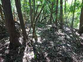 | 畝状竪堀を見るために西側斜面に降りてみる。写真は畝状竪堀。 | 畝が並んでいるのが見える。 |