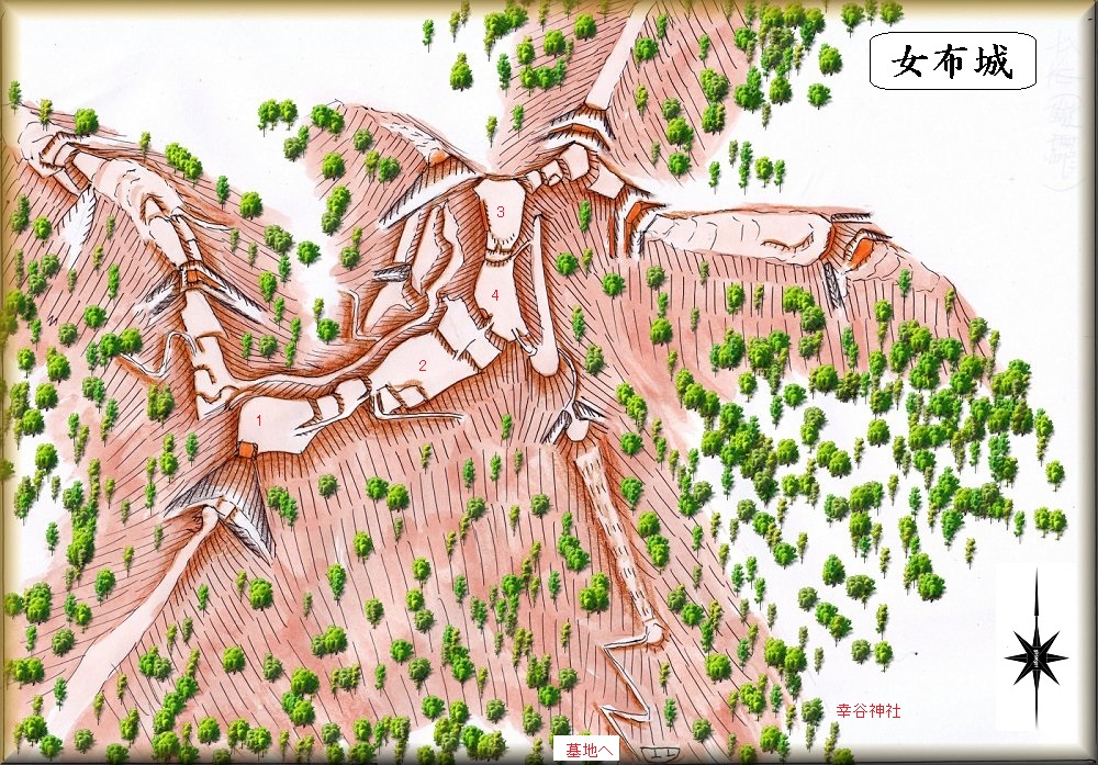 | 女布城の城主は森脇宗坡であったという。 森脇氏はもともとは土佐の出身であったが、永禄年間にこの地に来て城を構えたと言われている。 後に細川氏の攻撃を受けて降伏し、帰農したという。 落城後は細川氏によって改修されているのかもしれない。 |
