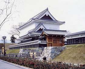 | 勝竜寺城の枡形門と櫓(管理棟)。堀はきれいに整備されすぎていて、ちょっとわざとらしい感じがする。 | |