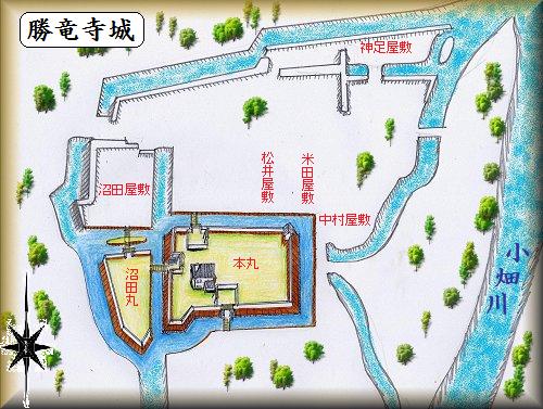 *鳥瞰図の作成に際しては、現地パンフレット等を参考にした。図のカラー部分が、おおむね現存している地域である。現在残っているのは、本丸と沼田丸の2郭だけである。この2郭周囲以外の堀は市街地化によって埋め立てられてしまっている。