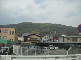 | 南側の国道171号方面から見た天王山。山上が広いので、あまり鋭さを感じない山である。ここからの比高は220mほどある。 |