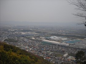 | 天王山はハイキングコースとなっているということもあり、わりとたくさんの人が山歩きをしていた。 | 途中の展望台から見た山崎古戦場。400年前、ここで羽柴秀吉と明智光秀との決戦が行われた。 |