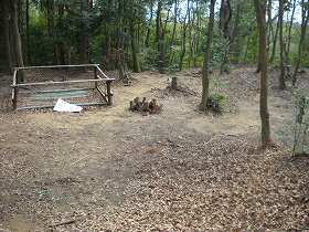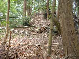 | 神社からあがって行くと、Aの土塁や堀切状の部分が見えてくる。しかし、内部は私有地で立ち入り禁止となっているので、形状を確認していない。 | 1郭内部。正面奥が山頂の天守台ということだが、それほど明瞭なものではない。 |
