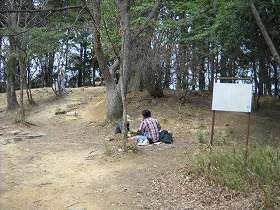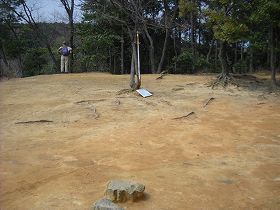 さらに進んでいくと、山頂部が目に入ってくる。とりあえず山頂まで登ってみると、そこは長軸30mほどの平場である。ここが本丸ということなのだろう。北側には石がゴロゴロした、わずかに高い土壇のようなものがあるが、これが天守台というやつなのであろうか。天守台があるというので、かなり期待していたのだが、実際にはたいしたものではない。本当にこのような場所に天守が建っていたものかどうか、疑問を感じるほどである。