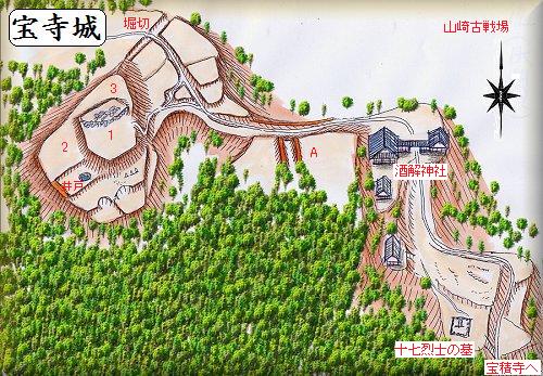 宝寺城は、山崎の合戦で有名な天王山の山頂を中心として築かれた城である。