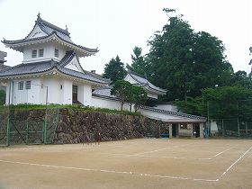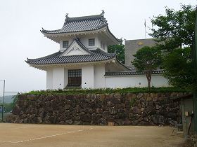 | 園部城の入り口。門と櫓は現存である。現在も園部高校の門として使用されている。 | 現存二重巽櫓。といっても、明治2年に完成したものだというので、けっこう新しい。外側に入口がついているというのが何とも不自然な造りである。 |