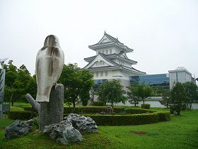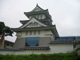 | 城址のすぐ脇にある園部公園内にある国際交流会館。まさに天守と呼ぶにふさわしい。しかし、模擬である。 | 近くで見ると、下部が文化会館となっている様子がよく分かる。園部城には背後の小麦山に三重櫓が建っていたというので、あながちこのようなものが存在していなかったというわけでもない。 |