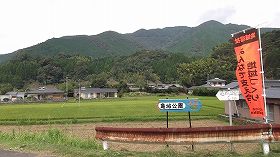 | 南側から遠望する飯野城。比高は30mほど。亀城公園の案内板が出ている。 | 公園の入口には冠木門が設置されている。 |