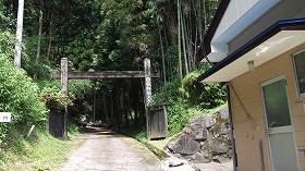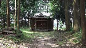 | 主郭入口の枡形状地形だが、神社に伴う改変かもしれない。 | 主郭にある神社。 |
