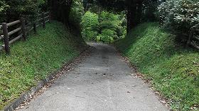 この県道部分はかつての堀切を利用したものであるという。もともと城のある部分は、県道の北側の部分と台地続きであったが、城を築城する際に掘り切ったのだと言われる。その跡を利用して県道が通っているというわけである。これを掘り切るのはそうとうの難工事であったことだろう。