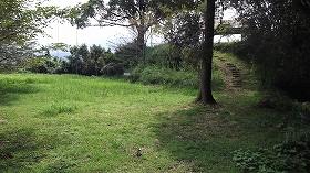 | 高城と中之城との間の通路を入って行く。両側は鋭い切岸である。 | 1郭内部。中之城との間は低い段差だけで区画されている。 |