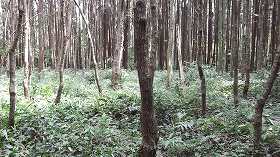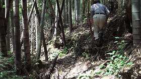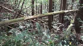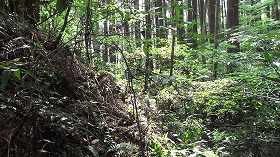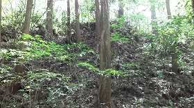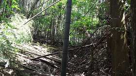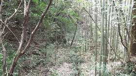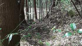 | 二ノ丸と三ノ丸との間の堀切。倒竹だらけである。 | 三ノ丸の城塁。横堀状の部分がある。 |